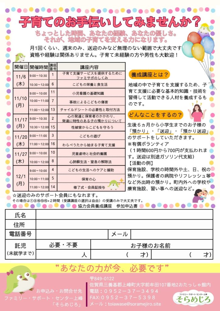 地域での子育て支援に興味のある18歳以上の健康な方(上峰町外でもOK)ならどなたでも参加できます。こどもを安心・安全にサポートする為に、講座内容は「こどもの栄養と食生活」「小児看護の基礎知識」「こどもの遊び」「心肺蘇生法」などその他とても有意義な講座になっています。自分の育児の為、お孫さんの為など講座のみ受けたい方でも大丈夫です。皆様のご参加お待ちしております。 ※今年度より保育士・子育て支援員の有資格者は講習の一部免除ができるようになりました。詳しくはお問合せ下さい。