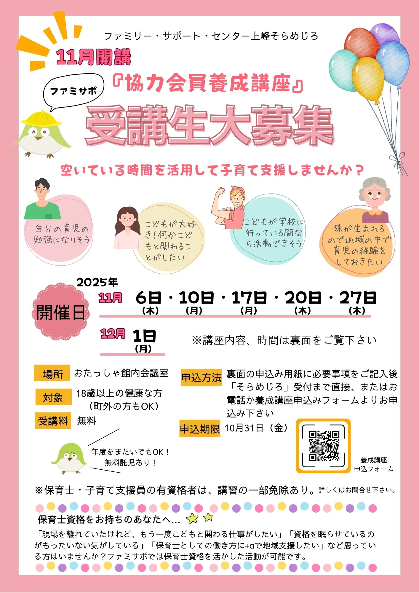 地域での子育て支援に興味のある18歳以上の健康な方(上峰町外でもOK)ならどなたでも参加できます。こどもを安心・安全にサポートする為に、講座内容は「こどもの栄養と食生活」「小児看護の基礎知識」「こどもの遊び」「心肺蘇生法」などその他とても有意義な講座になっています。自分の育児の為、お孫さんの為など講座のみ受けたい方でも大丈夫です。皆様のご参加お待ちしております。 ※今年度より保育士・子育て支援員の有資格者は講習の一部免除ができるようになりました。詳しくはお問合せ下さい。